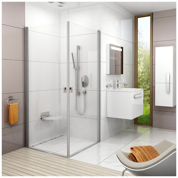 Скомбинировав две душевые двери, создадите квадратный или прямоугольный душевой уголок необходимой Вам планировки со входом до 125 см. Душевые двери можно использовать с неподвижной стенкой. Более комфортное принятие душа Вам обеспечит прямоугольный вариант душевого уголка. Вместо размера 90 x 90 см отдайте предпочтение, например, размеру 80 x 100 см, который занимает столько же места, но имеет больше выгод.