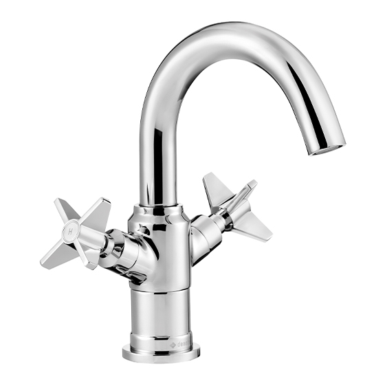 Смеситель для умывальника Deante Temisto BQT_021D. Двухвентильный смеситель имеет два вентиля с поворотным либо фиксированным изливом. Такой тип крана позволяет смешивать холодную и горячую воду, а также регулировать напор при помощи двух кран-букс. Керамический картридж отличается большей долговечностью, чем пластиковый, он хорошо выдерживает перепады давления и температуры воды. Аэратор служит для ограничения потока воды, ее очистки и уменьшает расход воды в несколько раз. Пробка click-clack круглая с переливом. Гальваническое покрытие.